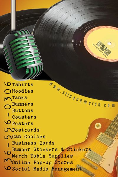 Many of our clients get "merch table" banners, large banners with their logo, and pop-up or pull-up banner stands. These banners roll up, have grommets, or are contained in a banner stand--so are all easy to travel with from gig to gig. Our artist designs them, we print and get them to you within 2 weeks of approved artwork and payment.